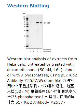 p57 Kip2 Antibody detects endogenous levels of total p57 Kip2 protein. The antibody does not recognize p27 Kip1.