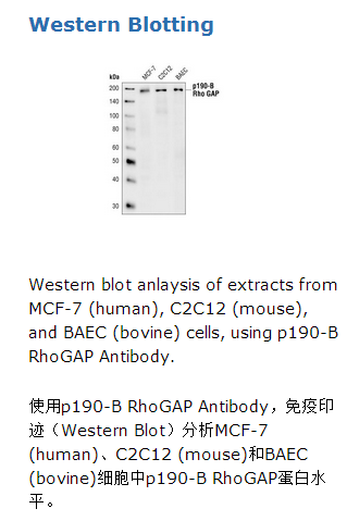 p190- B RhoGAP Antibody检测内源性RhoGAP总蛋白。通过人工合成人源p190-B RhoGAP蛋白Lys296位点周围相应的多肽片段去免疫动物从而制备出多克隆抗体。通过蛋白A和多肽亲和层析纯化抗体。Rho family small GTPases包括Rho、Rac和cdc42,该家族是不同的生物进程中的关键调节因子例如细胞骨架的构建、细胞生长和分化、转录调控以及细胞粘附/运动(1,2)。这些蛋白质的活性通过GTP的结合被控制,如以GTP结合状态那它们是活性状态,而如以GDP结合状态则它们是失活状态。三种调控性蛋白通过平衡GTP/GDP结合水平控制GTPases的活性:鸟嘌呤核苷酸交换因子(GEFs)通过GDP交换成GTP从而促进活性状态;鸟嘌呤核苷酸分解抑制剂(GDIs)隔绝GDP结合形式并且可能调节它们的细胞内定位;GTPase激活蛋白 (GAPs)增加GTP水解从而促进失活状态。p190 RhoGAP家族由两个相关蛋白p190-A和p190-B组成,它们都广泛表达并且包含有一个氨基端GTPase区域和一个羧基端RhoGAP催化区域。缺少p190-B RhoGAP的小鼠显示大量的Rho激活和在转录因子CREB的激活减少(3)。这些老鼠的表型类似于CREB敲除的老鼠,伴随着细胞体积减少和胸腺和神经发育的缺失(3)。缺失p190-B的细胞也展示脂肪形成的缺陷,认为这条通路对脂肪和肌细胞形成的开关作用是至关重要的 (4)。越来越多的证据显示p190经历酪氨酸磷酸化,这激活它的GAP区域(4-6)。酪氨酸磷酸化的水平通过Src过表达被提高(5,6)。IGF-1处理通过磷酸化和p190-B RhoGAP的激活从而下调Rho,因此IGF信号的提高涉及脂肪形成(4)。