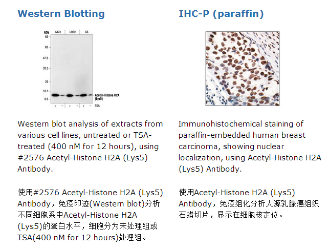 Acetyl-Histone H2A (Lys5) Antibody detects endogenous levels of histone H2A only when acetylated at lysine 5. This antibody does not cross-react with other acetylated histones.