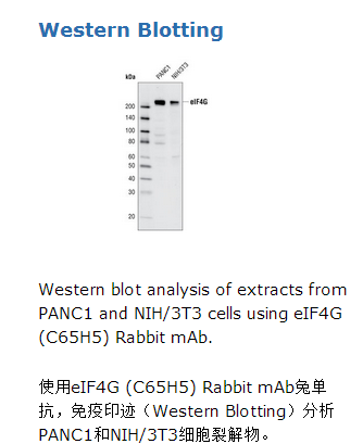 eIF4G (C65H5) Rabbit mAb detects endogenous levels of total eIF4G protein.