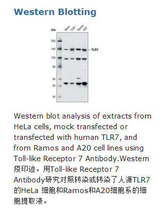 Toll-like Receptor 7 抗体能够检测内源水平TLR7蛋白总体水平。此多克隆抗体是通过合成人源对应的TLR7 C-末端周围的肽段来免疫动物而获得。抗体是通过protein A和多肽亲和层析纯化。Toll样受体(TLR) 家族成员, 是因与其密切相关的果蝇Toll受体而命名的,TLR在天然免疫中发挥了极其重要的作用(1-3)。TLRs 能够识别不同病原菌中保守的结构域并介导防御反应。TLR的触发导致了NF-κB信号通路的激活并因此调控下游的免疫和炎症基因的表达。TLRs与IL-1受体家族都包含一个大约200个氨基酸的保守区域—TIR结构域。受到激活后,TLRs 与细胞质中的含有TIR区域的一系列接头蛋白作用,包括MyD88 (myeloid differentiation factor), MAL/TIRAP (MyD88-adaptor-like/TIR-associated protein), TRIF (Toll-receptor-associated activator of interferon), and TRAM (Toll-receptor-associated molecule)。这些反应导致了IRAK1 和 IRAK4的招募和激活,并与TRAF6 形成复合体激活 TAK1 和 IKK。IKK的激活导致了正常情况下截留NF-κB在细胞质中而失去活性的IκB的降解。TLR7, 8 和9 形成一个结构上类似 TLR家族的一个组别,它们定位于细胞的内体内(4-6)。TLR7 在肺,胎盘和脾中表达量最高(4)。 TLR7 能够介导对合成化合物的应答包括imidazoquinolines, 以鸟嘌呤核苷为基础的一些诱导抗病毒的化合物(7)。TLR7对ssRNA病毒做出应答并激活NF-κB信号通路从而引起 IFN 的产生 (8-10)。
