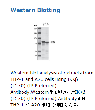 Polyclonal antibodies are produced by immunizing animals with a synthetic peptide corresponding to residues surrounding Leu570 of IKKβ protein. Antibodies are purified by protein A and peptide affinity chromatography.