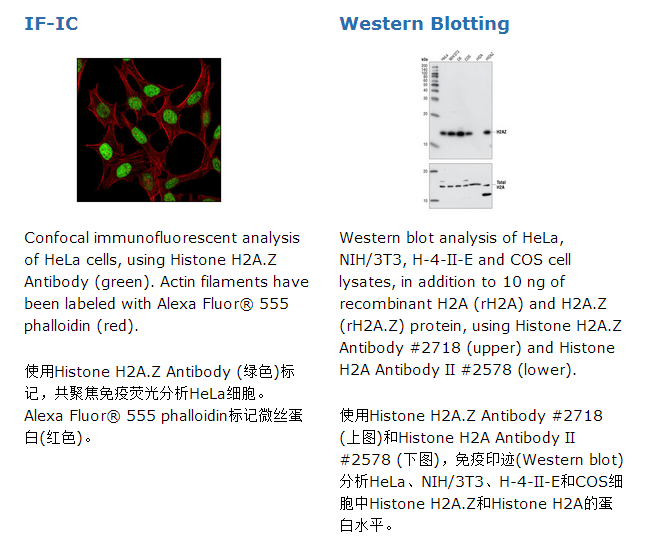 Histone H2A.Z Antibody detects endogenous levels of histone H2A.Z protein. The antibody does not cross-react with other histone proteins, including histone H2A.