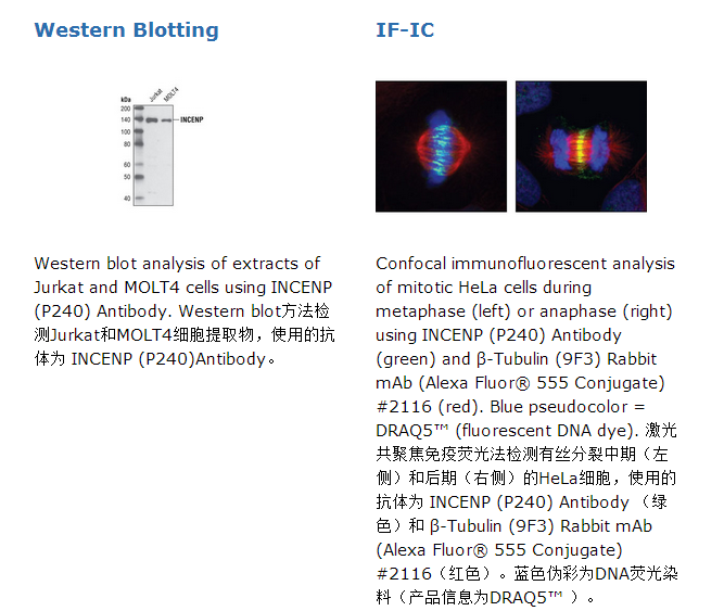 Polyclonal antibodies are produced by immunizing animals with a synthetic peptide corresponding to amino acids surrounding Pro240 of human INCENP. Antibodies are purified by peptide affinity chromatography.