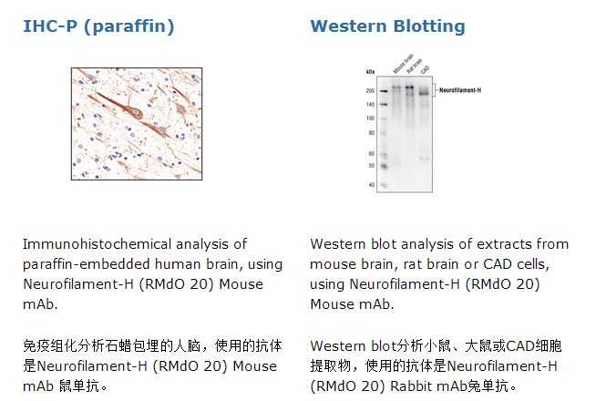 Neurofilament-H (RMdO 20)Mouse mAb 鼠单抗识别内源性的总Neurofilament-H蛋白。Neurofilament-H (RMdO 20) Mouse mAb 鼠单抗被报道能够识别人类样本中的NFM和NFH,但只能识别小鼠、大鼠及牛样本中的NFH (Lee, V.M. et al., 1988)。该单克隆抗体用大鼠Neurofilament免疫动物而制成。细胞骨架由三种胞内纤维构成:微丝,中间纤维和微管。Neurofilament是神经元中发现的主要的中间纤维,是组成轻 (NFL)、中 (NFM)、重 (NFH)三种纤维的亚基。与其它中间纤维蛋白的结构类似,neurofilament也具有球状的氨基端头,中央α-螺旋杆结构域和一个羧基端尾。它的前体纤维由一种异型四聚体单位(NFL-NFM和NFL-NFH)构成,八条这样的前体纤维组成一个典型的10nm的中间纤维。neurofilament在轴突径向生长和确定轴突口径中起作用,微管参与轴突伸长。PKA磷酸化NFL和NFM的头端结构域,抑制neurofilament聚集(3,4)。Neurofilament的聚集在许多人类神经系统疾病中被发现,包括帕金森病(与Lewy小体中α-synuclein伴随),阿尔茨海默氏病,腓骨肌萎缩症,肌萎缩性侧索硬化症(ALS)(1)。在NFH (-/-)小鼠上的研究表明,NFH在大髓鞘神经纤维中有调节离子通道的功能(5)。