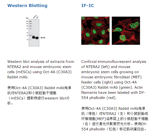 Oct-4A (C30A3)Rabbit mAb兔单抗识别内源性的总Oct-4A 蛋白.此单克隆抗体是通过重组蛋白免疫动物产生的。这种重组蛋白与邻近人源Oct-4A蛋白氨基末端的氨基酸残基序列一致.Oct-4 (POU5F1)是一类高表达于未分化胚胎干细胞和原始胚胎生殖细胞中的转录因子(1),一系列关键因子包括Oct-4, Nanog和 Sox2对保持多潜能性是必需的,Oct-4的下调显示能起始细胞分化(2,3)。Oct-4是一种非常有用的生殖细胞肿瘤标志物[4]。Oct-4存在两种剪接异构体Oct-4A and Oct-4B(5)。近来研究暗示Oct-4A异构体能给予并保持干细胞多潜能,而Oct-4B可能存在于某些体细胞和非多潜能性细胞中(6,7)。
