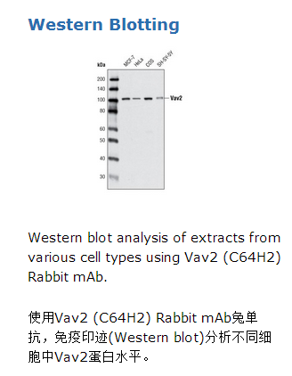 Vav2 (C64H2) Rabbit mAb兔单抗检测内源性Vav2总蛋白。基于免疫原性多肽的序列,该抗体不被期望与Vav1或Vav3蛋白发生交叉反应。通过人工合成人源Vav2蛋白羧基端周围相应的多肽片段去免疫动物从而制备出单克隆抗体。Vav蛋白是属于Rho/Rac小GTPases的鸟苷酸交换因子(guanine nucleotide exchange factor, GEF)Dbl家族。三种已鉴定的哺乳类Vav蛋白(Vav1, Vav2 and Vav3)它们的蛋白表达是不同的。Vav1蛋白仅在造血细胞中表达,并且涉及形成免疫突触。Vav2和Vav3蛋白大量表达。Vav蛋白包含Dbl同源区域,这给予GEF活性,以及蛋白质相互作用区域,该区域允许它们调节肌动蛋白细胞骨架组织的信号通路(1)。磷酸化刺激Rho/Rac的Vav蛋白GEF活性(2,3) 。