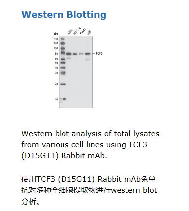 TCF3 (D15G11) Rabbit mAb detects endogenous levels of total TCF3 protein.Source / Purification