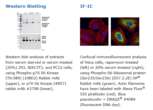 Each antibody in the p70 S6 Kinase Substrates Antibody Sampler Kit detects endogenous levels of its target protein. p70 S6 Kinase (49D7) Antibody #2708 also recognizes p85 S6 Kinase. Phospho-p70 S6 Kinase (Thr389) (108D2) Rabbit mAb #9234 also detects p85 S6 Kinase when phosphorylated at Thr412 and possibly S6KII when phosphorylated at Thr401. The other antibodies in the kit do not cross react with other proteins.