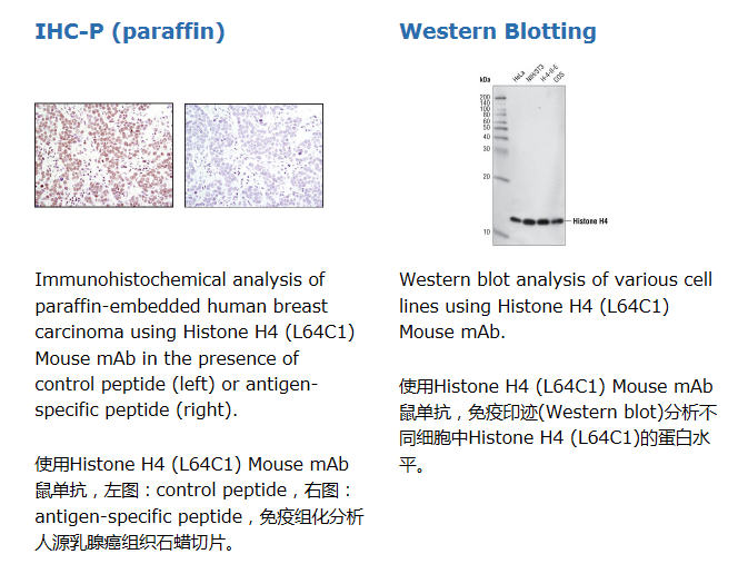Histone H4 (L64C1) Mouse mAb detects endogenous levels of total histone H4 protein. The antibody does not cross-react with other histones.