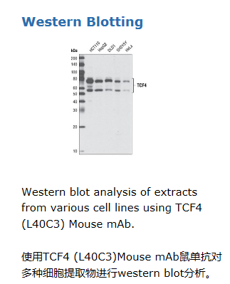TCF4 (L40C3) Mouse mAb detects endogenous levels of total TCF4 protein.