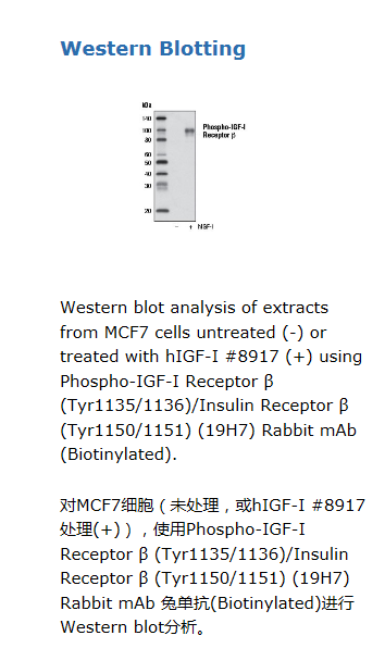 Phospho-IGF-I Receptor β (Tyr1135/1136)/Insulin Receptor β (Tyr1150/1151) (19H7) Rabbit mAb (Biotinylated) recognizes endogenous levels of IGF-I receptor and insulin receptor only when phosphorylated at Tyr1135/1136 or Tyr1150/1151, respectively. It does not cross-react with other related tyrosine-phosphorylated tyrosine kinases.