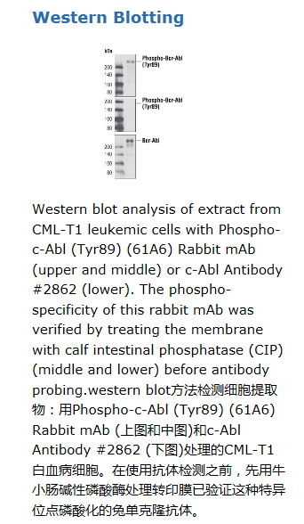 Phospho-c-Abl (Tyr89) (61A6) Rabbit mAb detects endogenous levels of c-Abl only when phosphorylated at Tyr89. This antibody may cross-react with other tyrosine-phosphorylated proteins.