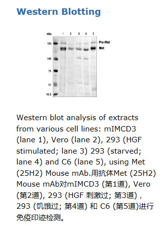 Met (25H2) 鼠单抗检测内源Met蛋白的表达。单克隆抗体通过用多肽免疫动物得到,该多肽是根据人的Met蛋白Tyr1234附近的氨基酸序列合成的。Met作为肝细胞生长因子 (HGF, 亦作扩散因子) 的高亲和性酪氨酸激酶受体是一个二硫键连接的异二聚体,含有一个45 kDa的 α-亚基和一个145 kDa的 β-亚基 (1,2)。α-亚基和β-亚基的氨基端形成胞外区,β-亚基的其余部分跨细胞膜并且含有一个具有激酶活性的胞内区。Met和HGF相互作用会导致多个酪氨酸位点的自磷酸化,继而招募下游信号分子Gab1, c-Cbl和 PI3 K激酶(3)。这一系列基础性事件对于Met激酶相关的所有生物学功能十分重要。胞内Tyr1003位点的磷酸化对于Met的泛素化和降解是必须的(4)。激酶结构域Tyr1234/1235的磷酸化对于Met的激酶活性十分关键。胞内 Tyr1349的磷酸化为Met提供了Gab1 的直接结合位点(5)。在肾、结肠和乳腺癌中发现有Met水平和/或激酶活性的改变,因此Met是肿瘤治疗和诊断的一个靶点(6,7)。
