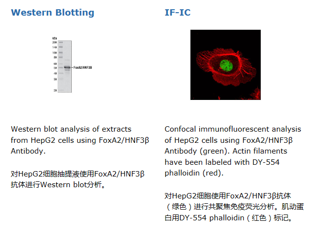 Polyclonal antibodies are produced by immunizing animals with a synthetic peptide corresponding to a sequence of human FoxA2/HNF3β. Antibodies are purified by Protein A and peptide affinity chromatography.