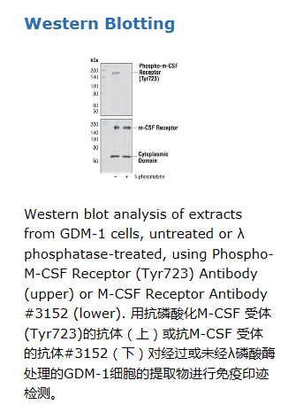 磷酸化M-CSF 受体(Tyr723)的抗体仅在内源性M-CSF 受体的Tyr723位点发生磷酸化时能检测到。多克隆抗体通过用多肽免疫动物得到,该磷酸化多肽是根据人的M-CSF 受体蛋白Tyr723附近的氨基酸序列合成的。抗体经过protein A和亲和层析纯化。巨噬细胞集落刺激因子(M-CSF, CSF-1)受体是由原癌基因c-fms编码的一种膜嵌合的酪氨酸激酶。M-CSF 受体表达在单核细胞(巨噬细胞及其前体细胞)上并促进这一系列血细胞的生长和发育(1-3)。M-CSF和它的受体结合后会引起受体二聚化、激活、以及细胞质内作为含SH2信号蛋白结合位点的酪氨酸残基自磷酸化(4)。至少有5个主要的酪氨酸自磷酸化位点。Tyr723 (小鼠Tyr721)位于激酶插入(KI)区。磷酸化的Tyr723能够与PI3K激酶的p85亚基以及PLC-γ 2结合(5)。磷酸化的Tyr809能够为Shc提供停泊位点(5)。该受体的过度激活会导致各种细胞体系呈现出恶性特征(6)。激活的M-CSF 受体表明晚期上皮样卵巢癌(7)和乳腺癌预后不良(8)。