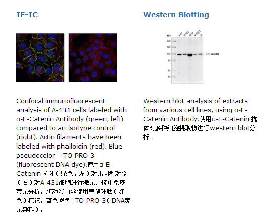α-E-Catenin Antibody detects endogenous levels of alpha-E catenin protein. The antibody may cross-react with neuronal α-N-catenin. In some cell lysates, the antibody may cross-react with a 50 kDa band of unknown origin.