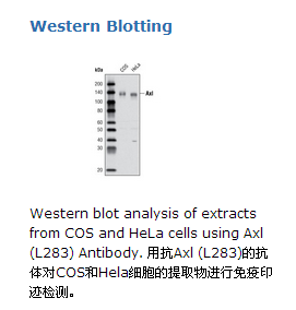 Axl (L283)抗体能检测内源总Axl 蛋白水平。本抗体不与其它相关蛋白交叉反应。多克隆抗体通过免疫动物得到,该合成多肽是根据人的Axl蛋白胞外区Leu283附近的氨基酸序列合成的。抗体经过protein A和亲和层析纯化。Axl、 Sky和 Mer是 受体酪氨酸激酶 (RTK) 家族的三个成员,它们有共同的胞内酪氨酸激酶区域和与胞外粘附分子相似的胞外区。这些受体酪氨酸激酶与维生素K依赖性的生长停滞特异性6蛋白(Gas6)结合,Gas6蛋白与S抗凝血因子蛋白结构上相关(1)。与受体结合后,Gas6能够激活PI3K激酶和它的下游靶分子Akt、 S6K和 NF-κB (2,3)。大量证据表明Gas6/Axl信号通路与正常细胞和癌细胞的生长和存活相关(4)。
