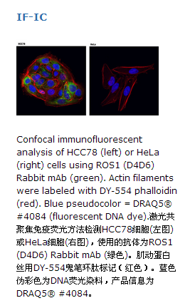 ROS1 (D4D6) 兔单抗能够识别内源性水平的总ROS1蛋白。当用western blot进行分析时,该抗体不与其他相关蛋白发生交叉反应。请注意,染色可能在ROS1重排的肺癌,巨噬细胞/巨细胞,反应性Ⅱ型肺细胞增生,上皮细支气管上皮化生区域可见。在胆管癌,肝癌和肾脏中已观察到未知特异性的染色。单克隆抗体是通过用一个蛋白免疫动物而制备的,该蛋白是人ROS1蛋白羧基末端区域的残基。ROS1是胰岛素受体家族的一个孤儿受体酪氨酸激酶,被初步确定为来自UR2肉瘤病毒的v-ros的同系物(1)。ROS1由一个大的胞外结构域,一个跨膜结构域和一个细胞内激酶结构域组成,其中胞外结构域由6个纤连蛋白重复序列组成。虽然ROS1的功能尚未定义,但已证明它在附睾上皮细胞分化中发挥重要的作用(2)。通过在胶质母细胞瘤中研究,初步确定第一个ROS1的致癌融合, FIG-ROS1(3),在随后的研究中发现这种融合在胆管癌(4),卵巢癌(5)和非小细胞肺癌(NSCLC)(6)中都存在。在非小细胞肺癌(1.6%的发生频率)中,研究者已经发现额外的致癌ROS1融合蛋白,其中ROS1的激酶结构域与若干种不同蛋白的氨基末端区域融合,这些蛋白包括CD74和SLC34A2(6-8)。ROS1融合蛋白激活SHP-2磷酸酶,PI3K/Akt/mTOR,ERK和STAT3通路(3,4,9)。