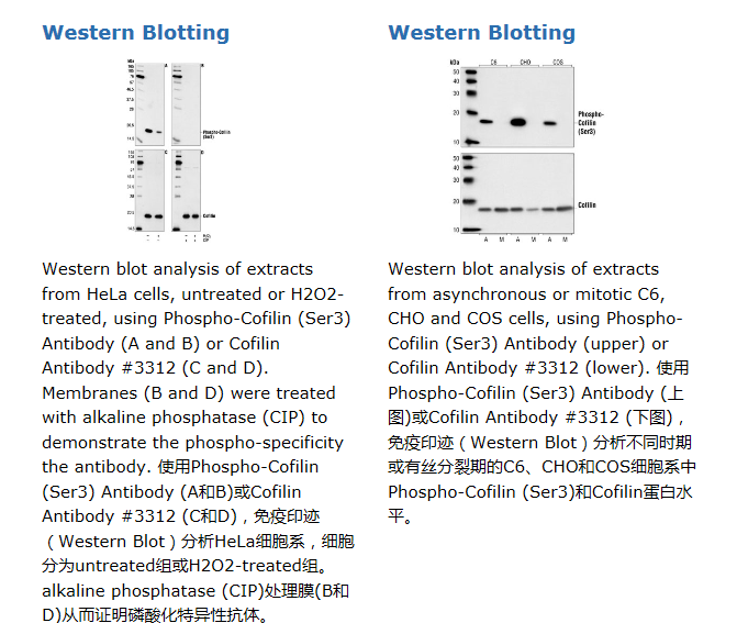 Phospho-Cofilin (Ser3) Antibody detects endogenous levels of cofilin only when phosphorylated at serine 3. The antibody may cross-react with phosphorylated cofilin 2, the muscle isoform.
