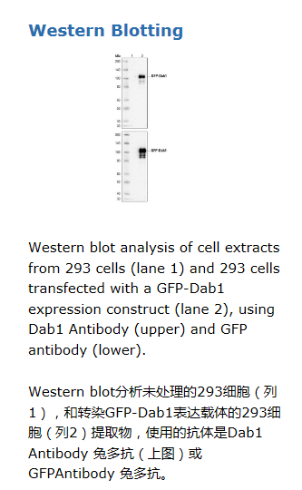 Dab1 Antibody detects transfected levels of Dab1 protein. This antibody does not cross-react with other proteins.
