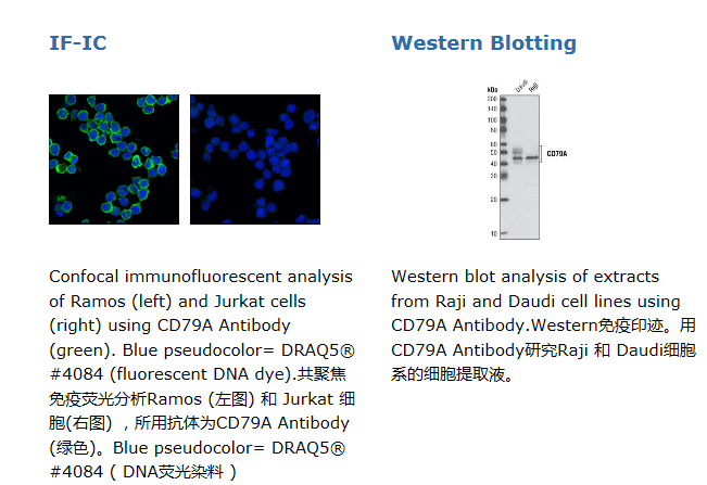 CD79A 抗体能够检测内源CD79A蛋白总体水平。此多克隆抗体是通过合成人源对应的CD79A Asn217位点周围的肽段来免疫动物而获得。抗体是通过多肽亲和层析纯化。B细胞上的抗原受体包含了异源二聚体信号成员,此二聚体由CD79A 和CD79B组成,也分别称作是Ig α和Ig β(1,2)。此受体复合体的存在对B细胞的发育和功能有着重要的意义(3)。抗原结合后,这两个蛋白和B细胞相关的受体一起起始胞内的信号转导T(4,5)。一个免疫受体酪氨酸相关的激活区域(ITAM)存在于CD79A胞内区域并对其功能发挥了重大的作用(6)。抗原结合,然后形成CD79A 和 CD79B异源二聚体,最后激活受体相关的激酶(7)。CD79A是B细胞系成淋巴细胞白血病的一个特征分子(8); 在有些慢性B淋巴细胞白血病中,对应mb-1基因的突变对异常低水平的功能性B细胞受体有重要的作用(9)。
