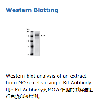 c-Kit的抗体能检测内源c-Kit蛋白的表达水平。本抗体不与其它酪氨酸激酶受体家族的成员发生交叉反应。多克隆抗体通过用多肽免疫动物得到,该多肽是根据人的c-Kit蛋白Met720附近的氨基酸序列合成的。抗体经过protein A和亲和层析纯化。c-Kit是受体酪氨酸激酶亚族的成员之一,这个家族包扩PDGF、 CSF-1和 FLT3/flk-2受体 (1,2)。它在造血干细胞、肥大细胞、黑色素细胞和生殖细胞等多种细胞的活化和生长过程中起重要作用(3)。通过和配体干细胞因子 (SCF)相结合,c-Kit发生二聚化/寡聚化并自磷酸化。激活的c-Kit能够招募下游含SH2信号传到成分,包括PLCγ、PI3K激酶的p85亚基、 SHP2和 CrkL,并使其酪氨酸磷酸化 (4)。导致c-Kit激酶功能减弱的分子损伤往往和各种发育异常相关(5),而促使c-Kit组成型活化的突变则能导致肥大细胞增多症和胃肠道间质肿瘤(6)。Tyr719位于激酶催化插入区域。Tyr719位点磷酸化的c-Kit 的能够在体内或体外与PI3K激酶的p85亚基结合(7)。
