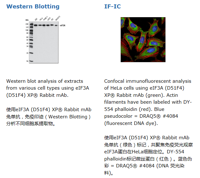 eIF3A (D51F4) XP® Rabbit mAb兔单抗检测内源性eIF3A总蛋白水平。通过人工合成人源eIF3A蛋白多肽片段去免疫动物从而制备单克隆抗体。翻译起始阶段40S核糖体与mRNA结合需要一些因子帮助。由eIF4E、eIF4A和eIF4G组成的起始因子eIF4F复合物能够与mRNA5’-端帽子结构结合。eIF4F和eIF4B在mRNA5’非翻译区解开mRNA的二级结构。与40S核糖体亚单位相互作用的一些真核翻译起始因子包括elF3能够结合mRNA 的5'末端帽子结构,随后沿着mRNA寻找起始密码子。elF3是一个含有10到13不同亚基的大翻译起始复合物。eIF3a、eIF3b、eIF3c、eIF3e、eIF3f和eIF3h对复合物的功能起到关键性作用,它们为核心亚基。eIF3可能通过与eIF4G的相互作用促进mRNA与40S亚基结合(1)。eIF3可以使Met-tRNAi•eIF2•GTP三联体复合物稳定地结合到40S核糖体亚基上,并有助于在加入60S核糖体亚单位之后保持这个复合物的完整(2)。研究证明mTOR能够和eIF3直接相互作用(3,4)。当用激素或有丝分裂信号刺激细胞时,mTOR结合eIF3复合物,并且使S6K1磷酸化(3)。这个过程将导致S6K1从eIF3分离同时S6K1被激活。激活的S6K1随后磷酸化下游靶蛋白包括核糖体蛋白S6和eIF4B,从而最终促使翻译加强。进一步研究证明在胰岛素刺激之后,活化的mTOR信号通路能诱导eIF3和eIF4G相互联系(3)。