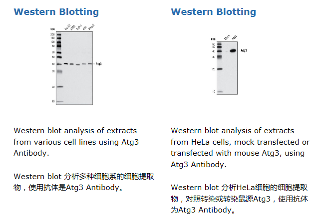Polyclonal antibodies are produced by immunizing animals with a synthetic peptide corresponding to residues near the amino terminus of Atg3. Antibodies are purified by protein A and peptide affinity chromatography.