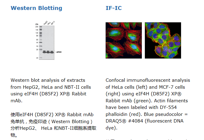 eIF4H (D85F2) XP® Rabbit mAb detects endogenous levels of total eIF4H protein.