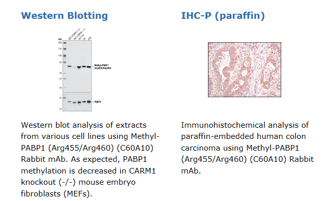 Methyl-PABP1 (Arg455/Arg460) (C60A10) Rabbit mAb detects endogenous levels of PABP1 only when methylated on Arg455 or Arg460.