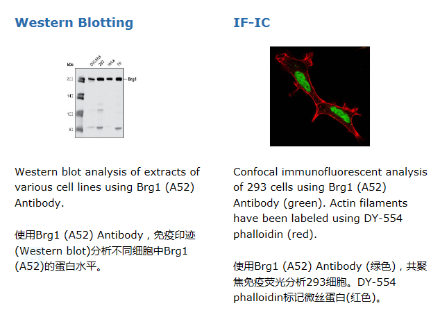 Brg1 (A52) Antibody能够检测内源性Brg1总蛋白水平。通过合成的与人源Brg1蛋白Ala52位点周围相应的多肽片段去免疫动物从而制备出此多克隆抗体。通过蛋白A和多肽亲和层析纯化获得。染色质结构的调整在转录激活和抑制的调节中是一个本质过程。至少两个从进化角度上有两个保守的过程进行修饰,ATP依赖的染色质改造蛋白干扰组蛋白和DNA联系,或者通过组蛋白尾部修饰包括甲基化和乙酰化。四类ATP依赖的组蛋白改造蛋白之一是SWI/SNF复合物,它的中心催化亚单位是Brg1或高度相关的蛋白hBRM(1)。SWI/SNF复合物包含不同的亚单位,但是它与Brg1或hBRM的关联仍然是不变的。研究显示SWI/SNF 复合物去调节基因激活、细胞生长、细胞周期和分化(1)。Brg1/hBRM已经显示通过提高糖皮质激素受体的转录激活去调节转录(2)。虽然通过与转录激活有关联,Brg1/hBRM也已经被发现在与转录抑制相关的复合物包括HDACs、Rb和Tif1β (3-5)。Brg1/hBRM在胚胎发育期间基因转录的调节中起着关键的作用。此外,Brg1/hBRM也作为一个肿瘤抑制因子的作用,并且Brg1在数个肿瘤细胞系中是突变的(6-8)。
