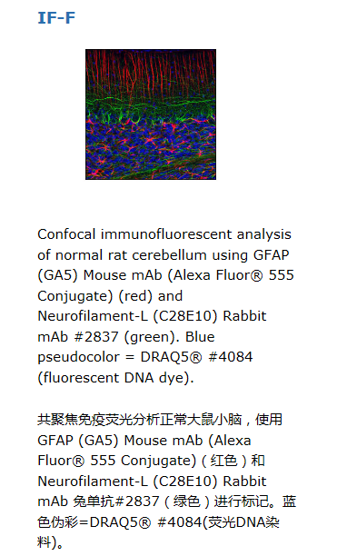 This Cell Signaling Technology antibody is conjugated to Alexa Fluor® 555 fluorescent dye and tested in-house for direct immunofluorescence of rat cerebellum. The unconjugated antibody #3670 reacts with human, mouse and rat GFAP protein. CST expects that GFAP (GA5) Mouse mAb (Alexa Fluor® 555 Conjugate) will also recognize GFAP in these species.