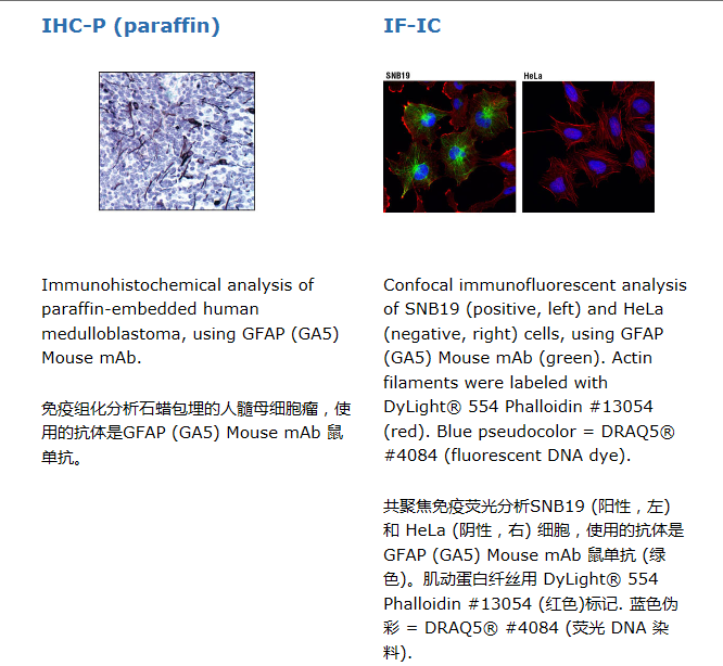 GFAP (GA5)Mouse mAb 鼠单抗识别内源性的总GFAP蛋白。该单克隆抗体使用从猪脊髓中纯化的天然的GFAP免疫动物所制。细胞骨架由三种胞内纤维构成:微丝,中间纤维和微管。中间丝的主要类型,特异性的在特定类型的细胞中表达:包括上皮细胞的细胞角蛋白,神经胶质细胞的胶质纤维酸性蛋白(GFAP),骨骼、内脏和某些血管平滑肌细胞中的desmin,间充质来源细胞中的vimentin蛋白和神经元中的神经丝。GFAP和vimentin在星形胶质细胞中形成中间纤维,调节它们的生存和形状(1)。vimentin纤维尤其存在于早期发育阶段,GFAP纤维是脑星形胶质细胞分化和成熟的特点。因此,GFAP通常用来作为星形胶质细胞所引起的颅内及椎管内肿瘤的标记(2)。此外,GFAP中间丝也在周围神经系统非髓鞘形成的雪旺氏细胞中存在(3)。
