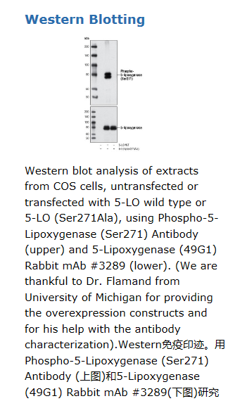 Phospho-5-Lipoxygenase (Ser271) Antibody detects transfected levels of 5-lipoxygenase protein only when phosphorylated at Ser271.