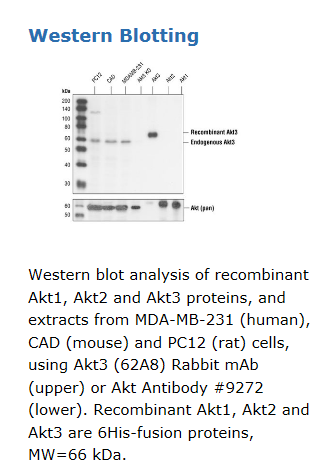Akt3 (62A8) Rabbit mAb detectes endogenous levels of total Akt3 protein. The antibody does not cross-react with recombinant Akt1 or Akt2.