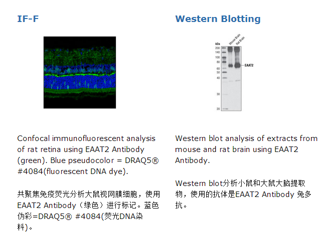 EAAT2 Antibody 识别内源性的总EAAT2蛋白。该多克隆抗体由合成的人类EAAT2蛋白氨基酸序列对应肽段免疫动物而制成。该抗体使用多肽亲和层析纯化而得。谷氨酸是哺乳动物中枢神经系统主要的兴奋性神经递质。神经传递过程中,谷氨酸被突触前细胞从囊泡释放,突触后细胞上的谷氨酸受体(如NMDA受体,AMPA受体)结合谷氨酸被激活。兴奋性氨基酸转运(EAATs)的调节和维持细胞外谷氨酸浓度低于兴奋水平。此外,谷氨酸转运体可能会限制突触的兴奋时间,这是由共转运三个钠离子和一个质子以及逆转运一个钾离子的电学过程来实现的。五个EAATs(EAAT1-5)的各有特点:EAAT2(GLT-1),主要在星形胶质细胞中表达,但也在视网膜神经元和胎儿发育时表达(1)。EAAT2纯合敲除的小鼠会有自发致命的癫痫发作和急性皮层损伤的倾向(2)。蛋白激酶C在谷氨酸转运时磷酸化EAAT2的Ser113(3)。