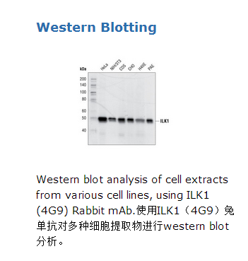 ILK1 (4G9) Rabbit mAb detects endogenous levels of total ILK1 protein. The antibody may cross-react with ILK2.