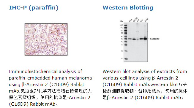 β-Arrestin 2 (C16D9) Rabbit mAb兔单抗能检测内源性总 beta-arrestin 2蛋白水平。该抗体不能识别转染的人源β-arrestin 1蛋白。该单克隆抗体通过使用与人源β-arrestin 2蛋白相一致的重组蛋白免疫动物而获得。Arrestin蛋白的作用是G蛋白偶联受体(GPCR)信号传导的负调节因子,同源配体的结合刺激了GPCR的磷酸化,随后Arrestin蛋白结合到磷酸化的GPCR上,导致受体的内化和GPCR信号传导的脱敏(1)。目前已在四种不同的哺乳动物体内发现了Arrestin蛋白,Arrestin1(也被称为S-arrestin)、arrestin 4 (或成为 X-arrestin) 分别存在于视网膜的视杆细胞和视锥细胞中。Arrestin 2 (也被称为β-arrestin 1) and arrestin 3 (或成为 β-arrestin 2) 广泛表达于各种组织,它们结合到多数GPCR上(2)。β-arrestin 蛋白作为适配器和支架蛋白发挥作用,此外该蛋白也参与其他反应,如通过ERK活化途径将c-Src蛋白家族聚集到GPCRs上 (3,4)。β-arrestins也参与一些受体酪氨酸激酶信号传导途径(5-8)。其他证据暗示β-arrestin蛋白能转移到细胞核内,并通过结合到转录辅助因子上而调节转录(9,10)。