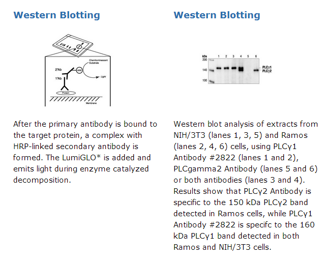 PLCγ1 monoclonal antibody is produced by immunizing animals with a synthetic peptide corresponding to residues surrounding Leu1220 of human PLCγ1 protein.Polyclonal antibodies are produced by immunizing animals with a synthetic peptide corresponding to residues surrounding human PLCγ1 and PLCγ2. Antibodies are purified by protein A and peptide affinity chromatography.