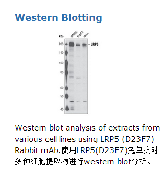 LRP5 (D23F7)Rabbit mAb兔单抗识别内源性的总LRP5 蛋白.单抗由合成肽段免疫动物产生,该合成肽段与邻近源LRP5 蛋白的Pro1527氨基酸残基序列一致。LRP5和LRP6是单次跨膜蛋白,隶属于低密度脂蛋白受体(LDLR)相关蛋白家族。不同于其他LDLR家族成员,LRP5和LRP6胞外域有4个EGF和3个LDLR重复序列,胞浆域富含脯氨酸(1)。它们在经典Wnt/β-catenin信号通路中作为Wnt的共同受体(2,3)。LRP5和LRP6高度同源并且在发育过程中有多种作用(4,5)。LRP5和LRP6的活性在与Dickkopf (DKK) 家族某些蛋白结合后被抑制(6,7)。Wnt信号通路被激活后,LRP6可以被如GSK-3和CK1之类的激酶在多个位点被磷酸化,例如1479位苏氨酸,1490位丝氨酸和1493位苏氨酸(8-10)。磷酸化的LRP6招募axin蛋白到膜上以激活β-catenin信号通路(8-10)。LRP5蛋白参与骨稳态调节。LPR5的多态性和突变与骨骼疾病相关,如骨质疏松-假神经胶质瘤综合症以及高骨密度症[11-13]。此外,在甲亢功能亢进肿瘤和乳腺癌的病人中也发现了LPR5的突变(14,15).