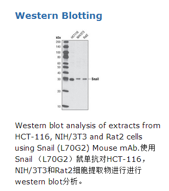 Snail (L70G2)小鼠单抗识别内源性的总Snail 蛋白.单抗由人源Snail 重组蛋白免疫动物产生.Snail 是锌指转录因子,能抑制E- cadherin转录,E- cadherin下调在胚胎发育中与上皮间质转换(EMT)有关,这与肿瘤细胞的侵袭过程有关(1-3),事实上,E- cadherin表达与一些肿瘤侵袭表型正相关,在上皮癌细胞系的Snail和E- cadherin 在mRNA水平也存在负相关关系(4,5)。另外,Snail参与阻断细胞周期,抑制细胞死亡(6)。由GSK-3和 PAK1磷酸化的Snail也参与其蛋白稳定性,细胞定位和其他功能(7-10) .