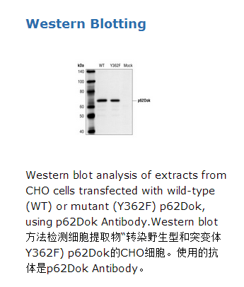 p62Dok Antibody detects transfected levels of p62Dok proteins. The antibody does not cross-react with related proteins.