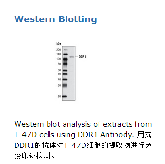 DDR1的抗体能检测到内源DDR1蛋白的表达。本抗体不与其它DDR1家族的蛋白发生交叉反应。多克隆抗体通过用多肽免疫动物得到,该多肽是根据人的DDR1蛋白Gly598附近的氨基酸序列合成的。抗体经过protein A和亲和层析纯化。盘状结构域受体(DDRs)是一种酪氨酸激酶受体,它的胞外区有一个盘状结构同源性重复,能够被与之相结合的胞外基质胶原激活。目前已知的哺乳动物的DDRs有两种:DDR1 和DDR2 (1)。它们广泛表达于人的组织中,并有可能与平滑肌细胞介导的胶原重塑相关(2)。DDRs异常表达并激活的下游通路可能与很多和基质降解和重构增加相关的人类疾病,如心血管疾病、肝纤维化和肿瘤侵袭性疾病密切相关(1)。