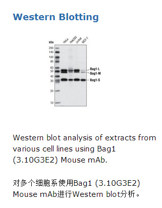 Bag1 (3.10G3E2) Mouse mAb识别内源性的Bag1总蛋白,包括长、中、短亚型。该单克隆抗体用重组全长人Bag1免疫动物而制成。Bag1属于Bcl-2相关athanogene(BAG)家族多功能蛋白质,是从人类分离的六个相关蛋白中的第一个(1,2)。这个广泛表达的蛋白与很多信号分子相互作用(包括Bcl2、HGF受体和Raf1),调节涉及细胞存活、生长和分化的信号通路。Bag1蛋白最常见的功能是抑制促进凋亡的蛋白(2-4)。Bag1也在Raf1信号通路中扮演角色,可以作为转录激活因子结合DNA(4)。Bag1蛋白是其结合物HSP70的了解较多的抑制剂(5)。Bag1羧基末端的BAG结构域与HSP70的ATP酶域相互作用,负向调节热休克蛋白分子伴侣活性(6,7)。Bag1蛋白的多个亚型从一个序列中转录生成,共享一个常见的泛素同源结构域和一个羧基末端Hsp70结合区域,但在长度和细胞定位上有区别。50kDa长的Bag1-L亚型包含一个核定位信号,常在细胞核内发现,激活转录。46kDa中等长度的Bag1-M亚型主要在细胞质中发现,但也可以在与其它蛋白质结合后转位到细胞核。29-33kDa亚型(Bag1-S、Bag-1)主要发现在细胞质中(8)。高表达抗凋亡Bag1蛋白与某些癌症患者增加的存活率相关,导致研究者研究Bag1蛋白潜在的抗肿瘤作用(9)。