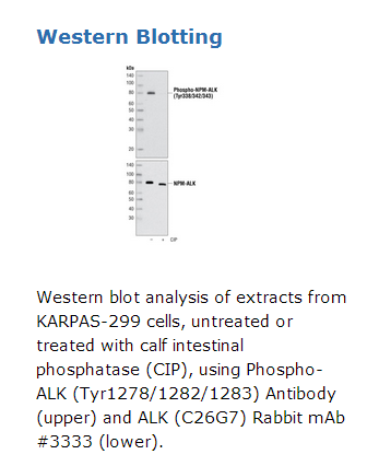 Anaplastic lymphoma kinase (ALK) is a tyrosine kinase receptor for pleiotrophin (PTN), a growth factor involved in embryonic brain development (1-3). In ALK-expressing cells, PTN induces phosphorylation of both ALK and the downstream effectors IRS-1, Shc, PLCγ, and PI3 kinase (1). ALK was originally discovered as an NPM (nucleophosmin)-ALK fusion protein produced by a translocation (4). The NPM-ALK fusion protein is a constitutively active, oncogenic tyrosine kinase associated with anaplastic lymphoma (4). Activation of PLCγ by NPM-ALK has been suggested to be a crucial step for its mitogenic activity and may be important in the pathogenesis of anaplastic lymphomas (5). A distinct ALK oncogenic fusion protein involving ALK and EML4 has been described from a non-small cell lung cancer cell line, with corresponding fusion transcripts present in some cases of lung adenocarcinoma. The short, amino-terminal region of the microtubule-associated protein EML4 is fused to the kinase domain of ALK (6,7).Phosphorylation of ALK on Tyr1278/Tyr1282/Tyr1283 was identified at Cell Signaling Technology (CST) using PhosphoScan®, CST's LC-MS/MS platform for phosphorylation site discovery. Phosphorylation of ALK at these three sites was observed in select carcinoma cell lines and in tumors (6).
