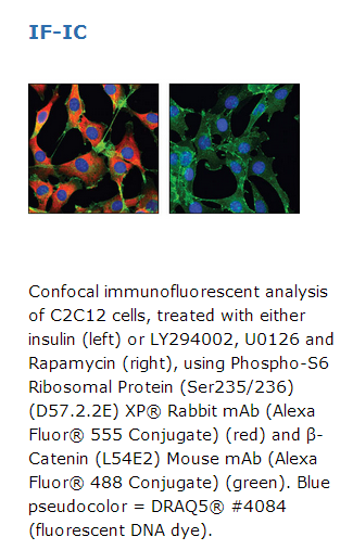 Phospho-S6 Ribosomal Protein (Ser235/236) (D57.2.2E) XP® Rabbit mAb (Alexa Fluor® 555 Conjugate)检测仅在serine 235和236位点磷酸化的内源性ribosomal protein S6。通过人工合成人源ribosomal protein S6蛋白Ser235和Ser236位点周围相应的磷酸化片段去免疫动物从而制备单克隆抗体。该抗体以F/P 比值为2-6的最佳条件连接着Alexa Fluor® 555。Cell Signaling Technology抗体偶联Alexa Fluor® 555 fluorescent dye,并且用免疫荧光分析在内部检测人类细胞。该抗体与未接合的Phospho-S6 Ribosomal Protein (Ser235/236) (D57.2.2E) XP® Rabbit mAb兔单抗 #4858具有相同的物种之间交叉反应活性。生长因子和有丝分裂原有效促进维持细胞生长和增殖的一个方面就是通过上调mRNA翻译(1,2)。生长因子和有丝分裂原能诱导p70 S6激酶的激活和随后S6核糖体蛋白的磷酸化。S6核糖体蛋白的磷酸化与mRNA转录本的翻译增加有关,而这个mRNA转录本是在5端非翻译区含有一个寡嘧啶区(2)。这些特殊的mRNA转录本 (5'TOP) 能够编码涉及细胞周期进程的蛋白质如翻译必须的核糖体蛋白和延伸因子(2,3)。重要的S6核糖体蛋白的磷酸化位点包含数个定位在S6蛋白一个小的羧基末端区域残基(Ser235, Ser236, Ser240, and Ser244) (4,5)。