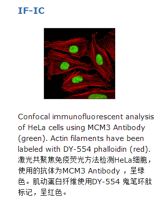 MCM3 Antibody能够检测内源性MCM3总蛋白。该多克隆抗体是由合成的人源的针对MCM3蛋白氨基末端肽段免疫动物,利用蛋白A和多肽亲和层析技术生产的。 微小染色体维持(MCM)蛋白2-7是DNA复制起始和延伸所需的6个相关蛋白家族。 MCM2到MCM7蛋白相互结合,形成异源六聚体MCM复合物,被认为充当了DNA复制叉的复制解旋酶(1-5)。该复合体也是前复制复合体(pre-RC)的关键组成部分(回顾1)。Cdc6 和 Cdt1招募MCM复合体至有丝分裂末期/G1早期的起始识别复合体(ORC)形成pre-RC,促进DNA复制(2中已论述)。MCM2, MCM3, MCM4和MCM6亚单位的磷酸化似乎调节MCM复合体的活性和DNA合成的启动(6-8)。DNA复制时MCM蛋白被清除,通过pre-RC重构的抑制引起染色质未识别化。染色质批准允许每个细胞循环DNA复制一次,有助于保证基因选择和避免恶性肿瘤细胞的产生(回顾3)。研究亦表明MCM复合体通过保护复制叉的结构参与检验点控制,而且可以招募捕获后的检验点蛋白协助复制重启(回顾3,9)。