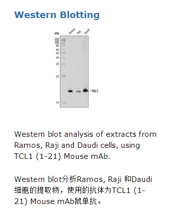TCL1 (1-21) Mouse mAb检测内源性TCL1 p蛋白总量。该单克隆抗体是用TCL1免疫动物生产得到。MTCP1和CL1b 都属于TCL1原癌基因家族,它们编码的蛋白参与了胚胎发育、T细胞癌变、前淋巴细胞癌变和B细胞癌变等过程中的Akt 激活(1-3)。TCL1 中的Akt 相关基团能够结合Akt基因中的PH基团。 TCL-Akt低聚物复合体的形成是TCL1 共活化的前提,能够导致Akt 的磷酸化和激活。更主要的是,功能分析揭示TCL1 和Akt 的相互作用能够促进Akt 向细胞核的转运(4-6)。TCL1的晶体结构支持了以上发现,并暗示TCL1 可能参与了分子转运(7)。