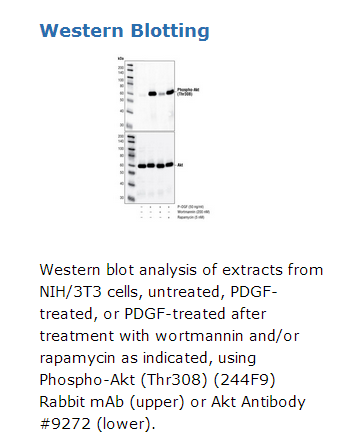 Phospho-Akt (Thr308) (244F9) Rabbit mAb兔单抗能够检测内源性的Thr308位点磷酸化的Akt蛋白含量。该单克隆抗体是采用合成的与小鼠Akt蛋白的Thr308残基周围序列相对应的磷酸肽免疫动物生产而得到。Akt,又被称为PKB 或 Rac,在细胞的生长和凋亡中起到关键作用(1-3)。该蛋白激酶可以被胰岛素和多种生长和存活因子激活,在涉及PI3K激酶的wortmannin敏感信号通路中发挥作用(2,3)。Akt可由磷脂结合激活,该过程通过活化环中的Thr308位点以及羧基端Ser473位点的磷酸化完成,其中Thr308的磷酸化由PDK1完成(4)。 之前推测PDK2在Ser473位点磷酸化Akt,后被证实为哺乳动物rapamycin靶蛋白mTOR 的作用, 它存在在一个含有rictor和Sin1 的rapamycin非敏感复合体中。 Akt促进细胞的生长通过抑制细胞的凋亡 ,例如Akt可以抑制下游靶蛋白Bad (7), forkhead 转录因子 (8), c-Raf (9), and caspase-9。PTEN是PI3K/Akt信号通路的主要负调控因子(10)。 LY294002是特异性的 PI3K 激酶抑制剂(11)。Akt 的另外一个主要功能是通过磷酸化并进而抑制GSK-3α 和 β来调控糖原的合成(12,13)。 Akt 也可以调控胰岛素诱导的葡萄糖转运 (12)。除此之外,Akt还可以调控细胞周期,这个功能通过抑制GSK-3β,从而调控其下游的Cyclin D1 的磷酸化和降解 (14),或者负向调控cyclin依赖的激酶抑制因子 p27 Kip (15) 和 p21 Waf1/CIP1 (16)来实现。 Akt 也可以通过直接磷酸化含有raptor的rapamycin敏感复合体中的mTOR来调控细胞的生长(17)。 更重要的是, Akt磷酸化并失活TSC2, 而TCS2是mTOR-raptor复合物中mTOR的抑制因子(18,19)。